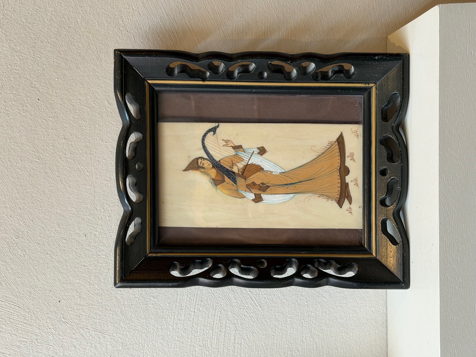 Miniatur painting of a harp player in carved wooden frame.
